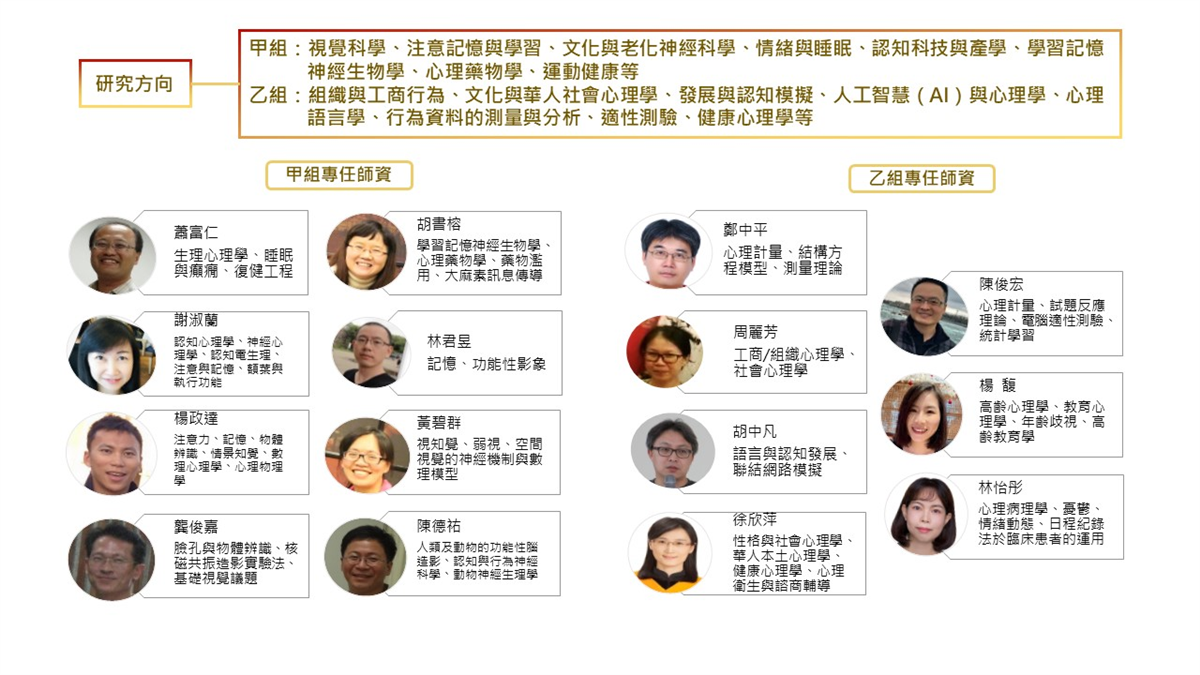 在科技部人文社會司的推動、與本系的主導下,國立成功大學設立了跨領域心智影像研究中心,整合中、南、東台灣近二十所學校百位之社會人文、生物醫學、影像工程、統計分析等專家,投入腦與心智神經科學的教學與研究。本系多位認知神經科學的老師不僅協助此一跨領域研究中心的重要事務,並開發「認知神經科學」、「情緒神經科學」、「老化神經科學」等研究領域。此外,本系也已購置多套的先進腦訊號測量儀器,與台大、政大、台師大專家共同進行心智運作機制之探討。最後,在課程方面,也透過必修與選修科目的規劃,長期培育腦科學相關之心理學人才。