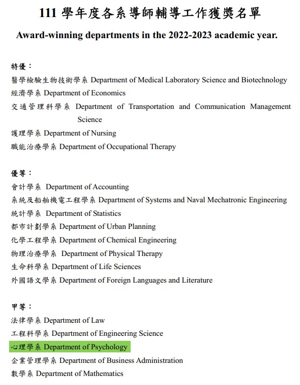 【賀】本系獲得111 學年度導師輔導工作甲等