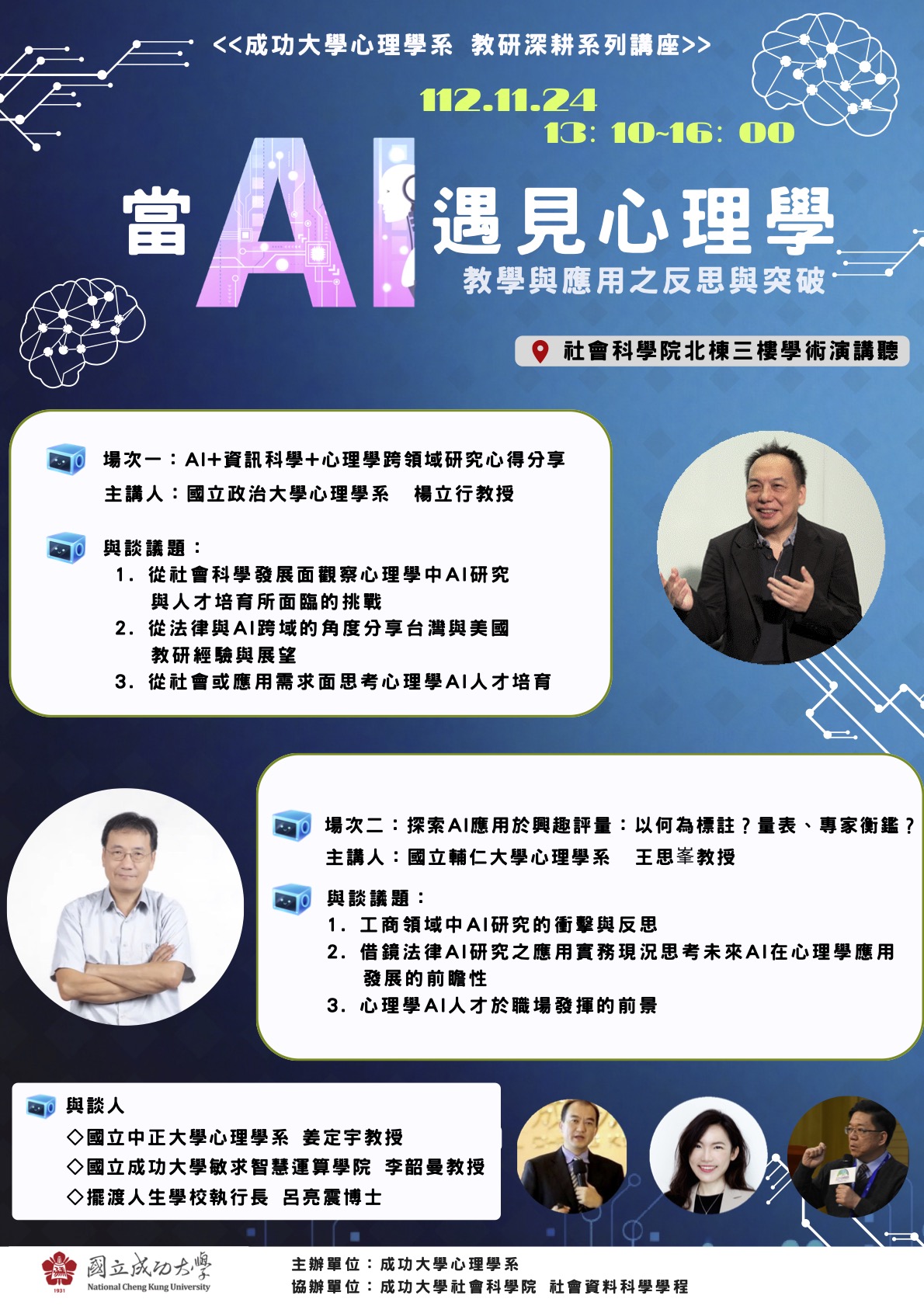 【演講公告】成功大學心理學系 教研深耕系列講座「當AI遇見心理學:教學與應用之反思與突破」