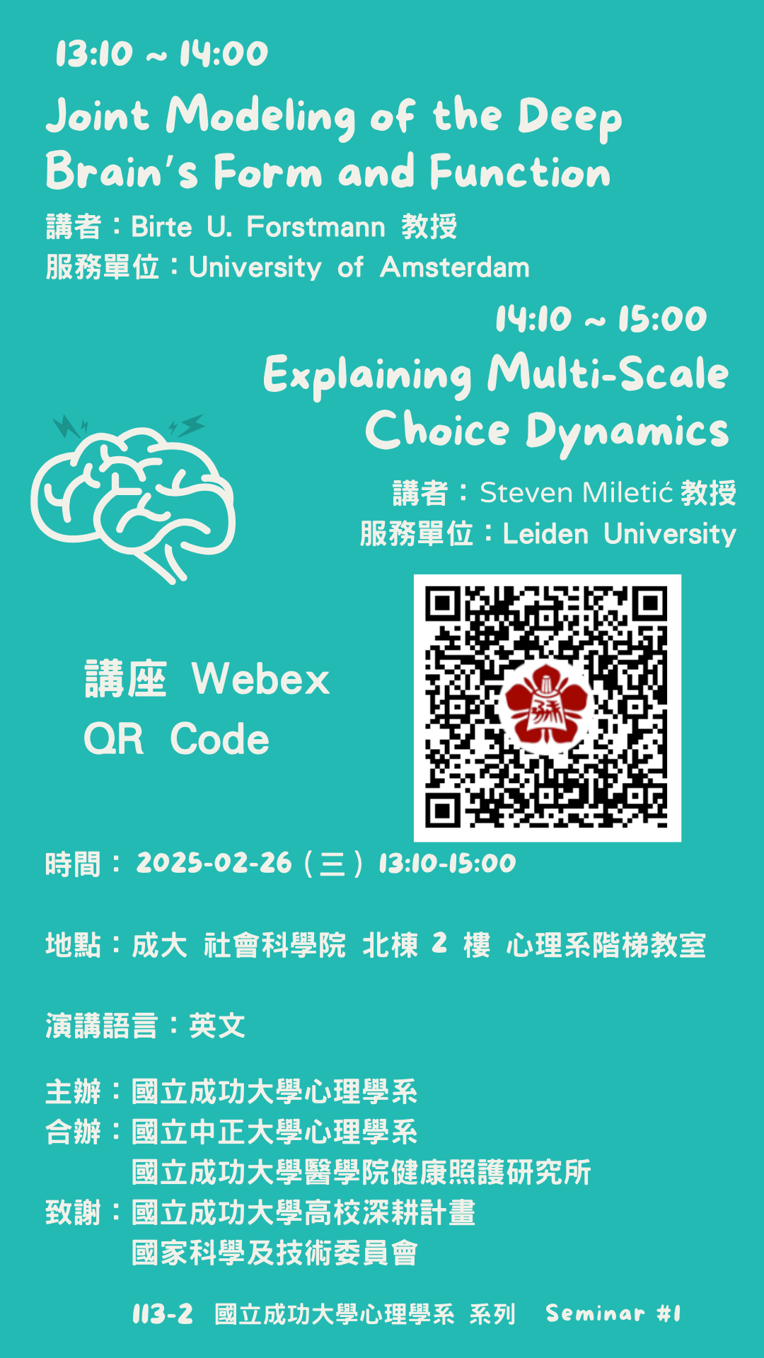 2/26 (三)邀請來自荷蘭 University of Amsterdam 的 Birte U. Forstmann 教授和 Leiden University 的 Steven Miletić 教授為大家帶來一場演講包含兩個講題和個別的 Q&A 時間,演講相關訊息請參考以下: