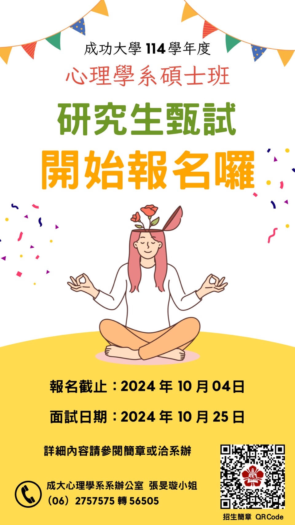 🌟【成功大學心理學系114學年度碩士班甄試招生中】🌟