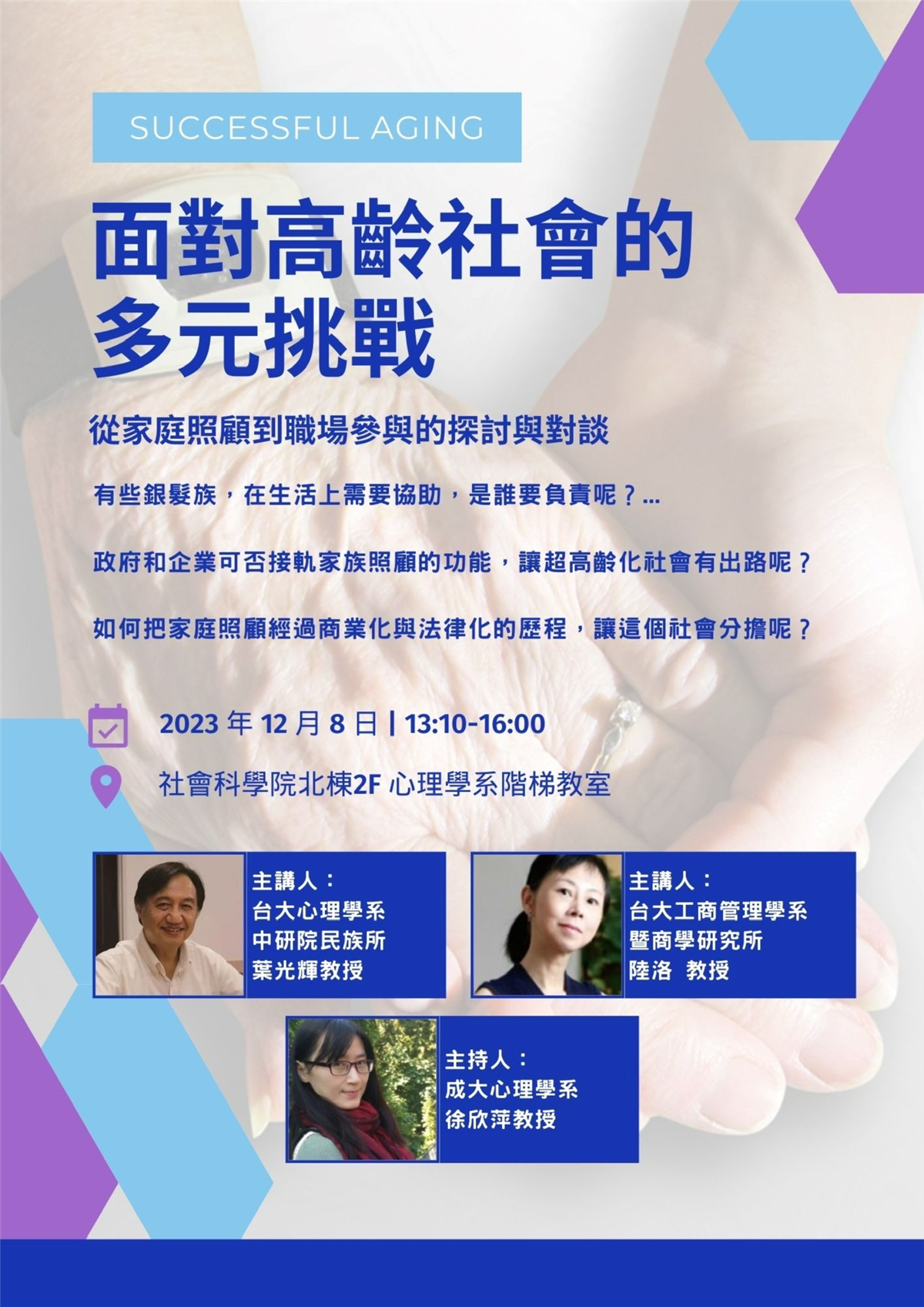 透過葉光輝教授和陸洛教授的專業知識和見解,本次活動將為參與者提供一個多角度解析高齡化問題的機會,並深入理解和反思這一社會現象對家庭和工作的影響。