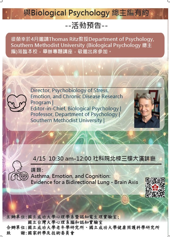 2025/4/8 【演講公告】4/15 與《Biological Psychology》總主編有約II 🎤【專題演講預告】與《Biological Psychology》總主編有約II 這是一次難得的學術盛會,無論您關注神經科學、心理生理學,或對期刊投稿有興趣,都絕對不能錯過! 📣 誠摯邀請所有師生踴躍參加,一起開拓視野、激發研究靈感! <Back