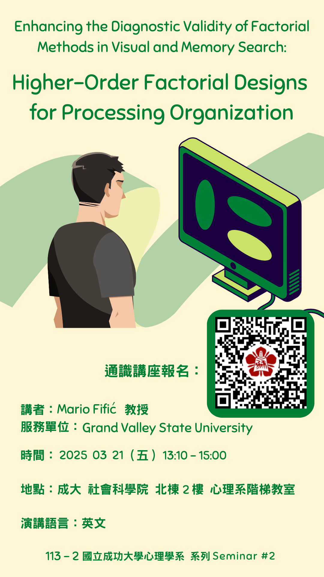 講題:Enhancing the Diagnostic Validity of Factorial Methods in Visual and Memory Search: Higher-Order Factorial Designs for Processing Organization/ 增強視覺和記憶搜尋中因子方法的診斷效度:用於處理組織的高階因子設計