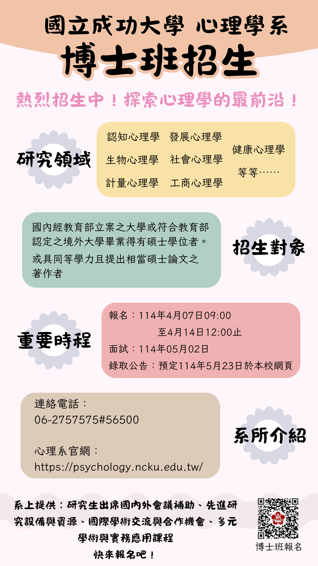 2025/3/27 【招生公告】114學年度心理學系博士班招生開跑! 114學年度心理學系博士班招生開跑! 想更深入探索心理學的世界嗎?成功大學心理學系博士班熱烈招生中,誠摯邀請充滿熱忱的你一起加入我們的研究行列! 報名開放時間:114年4月7日 09:00 起 報名必備:完成報名費繳交 + 備審資料上傳 入學時間:2025年9月,等你來挑戰! 不論你熱愛實驗研究、心理測量,還是對人類行為充滿好奇,這裡都有屬於你的舞台! 博士班報名資訊:https://reurl.cc/6KDjkO 快來加入我們,一起探索心理學的奧秘吧! <Back