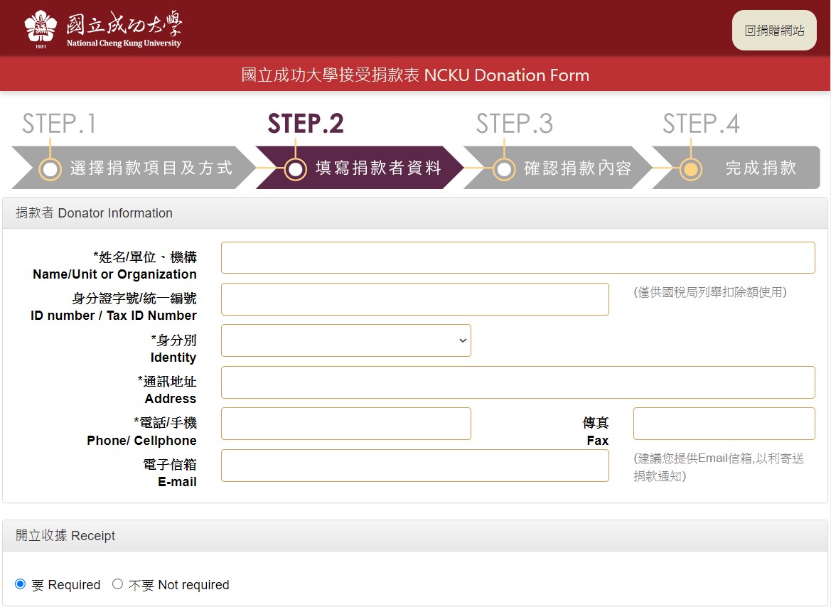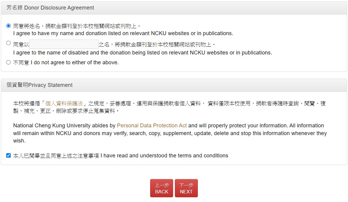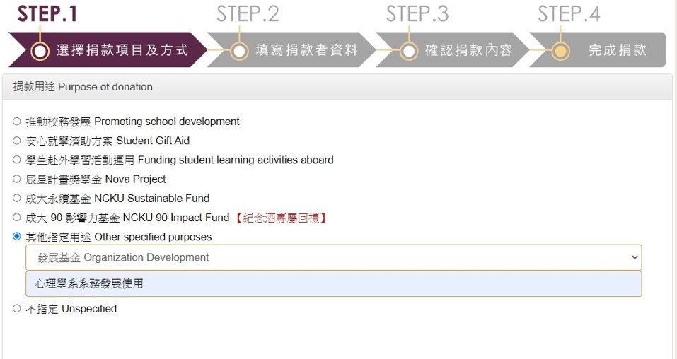 2018/1/2 【捐款專區】 國立成功大學捐款平台 https://donate2.ncku.edu.tw/index.php 進入後選擇「其他指定用途」,下拉選項選擇「其他」後填寫用途為「心理學系系務發展使用」 可選擇各類不同捐款方式,並依序填寫基本資料即可完成,非常感謝您對於國立成功大學心理學系的系務支持! 檔案下載 ▪ 捐款方式.pdf <Back