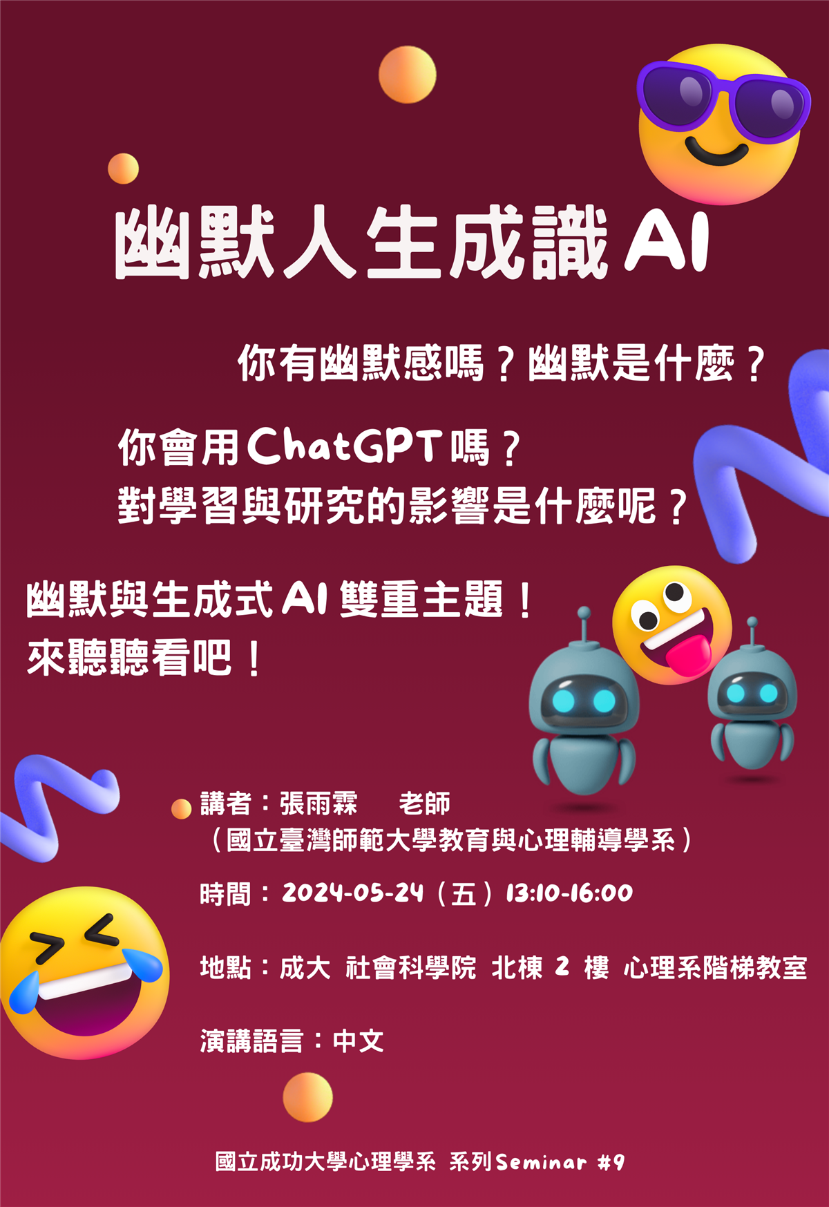【演講公告】0524 幽默人生成識AI:幽默心理學簡介與生成式AI之應用