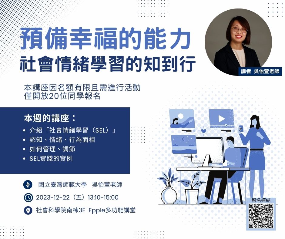 本週的講座,將介紹「社會情緒學習(SEL)」的內涵與重要性,闡述相關的認知、情緒、行為面相,並說明我們如何管理、調節這些面向,最後體驗SEL實踐相關的實例。