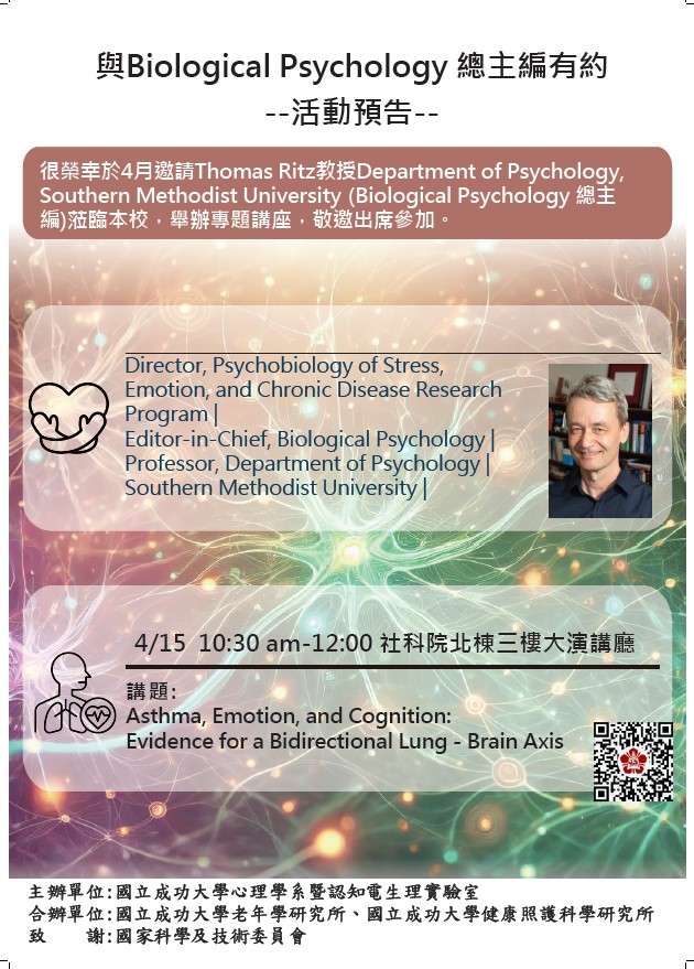 【演講公告】04/15與Biological Psychology總主編有約