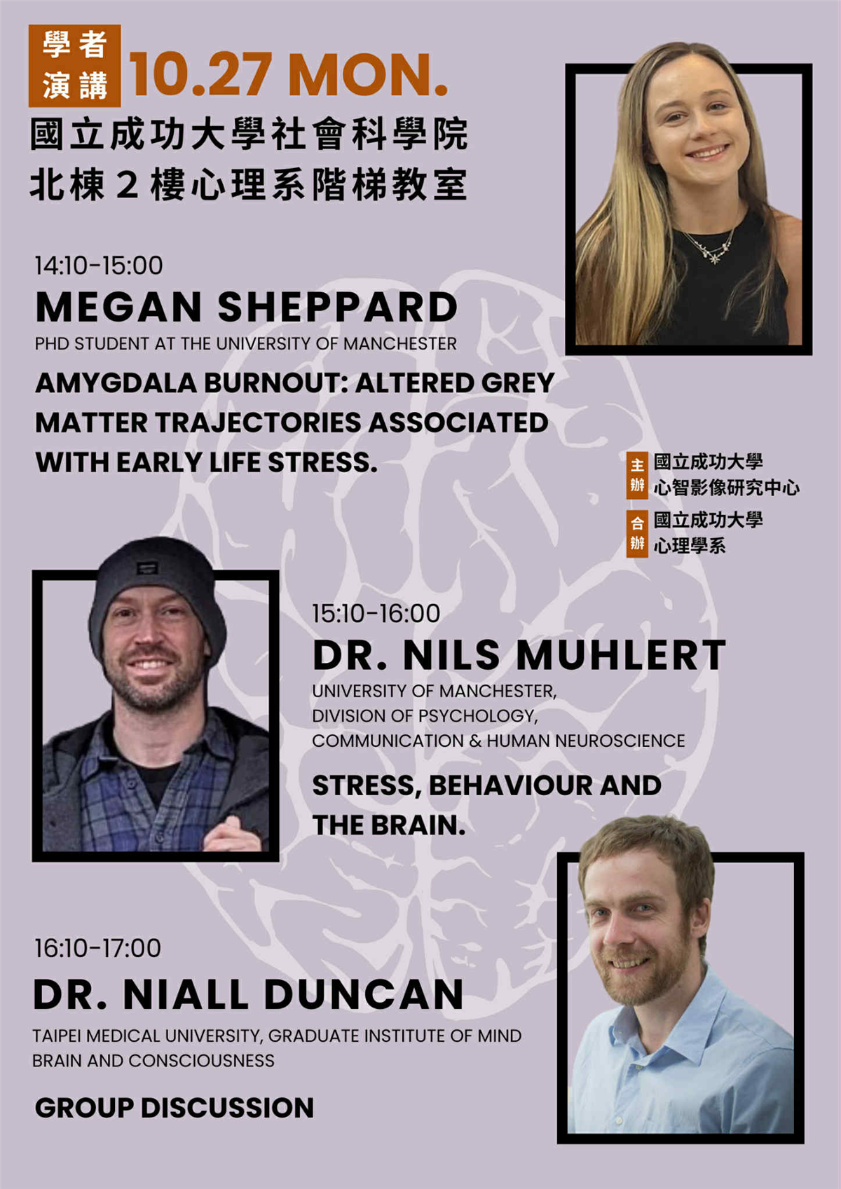 【演講通知】10/27(週一)Niall Duncan 教授團隊蒞臨本系與MRI中心演講:Stress, Behavior and the Brain