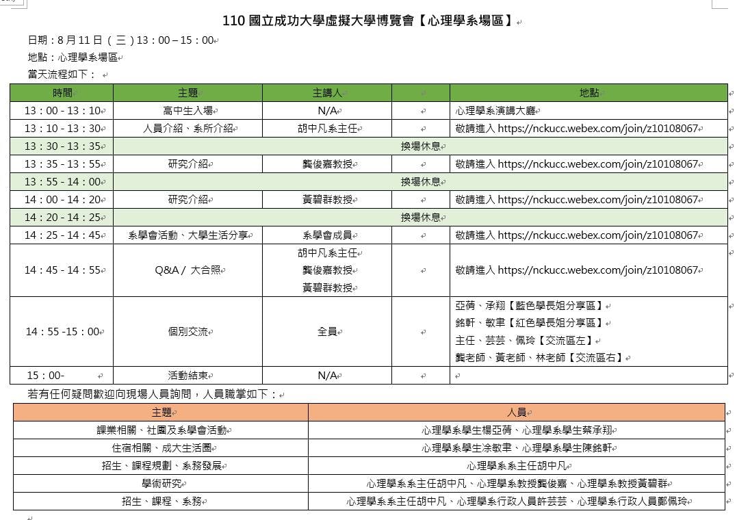 2021成功大學虛擬博覽會心理學系活動行程表