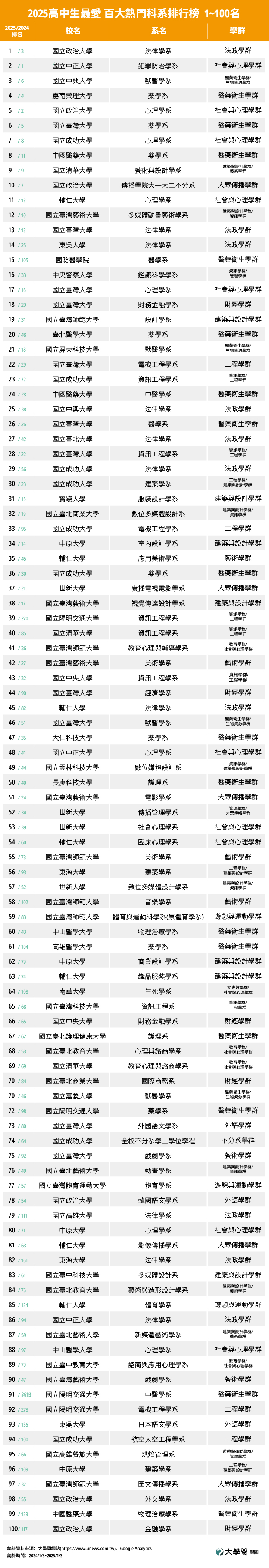 【大學問】網站根據2024/1/3~2025/1/3來自449萬人不重複使用者5,319萬筆瀏覽數,從全國2,658科系中排行出點閱率最高的校系。