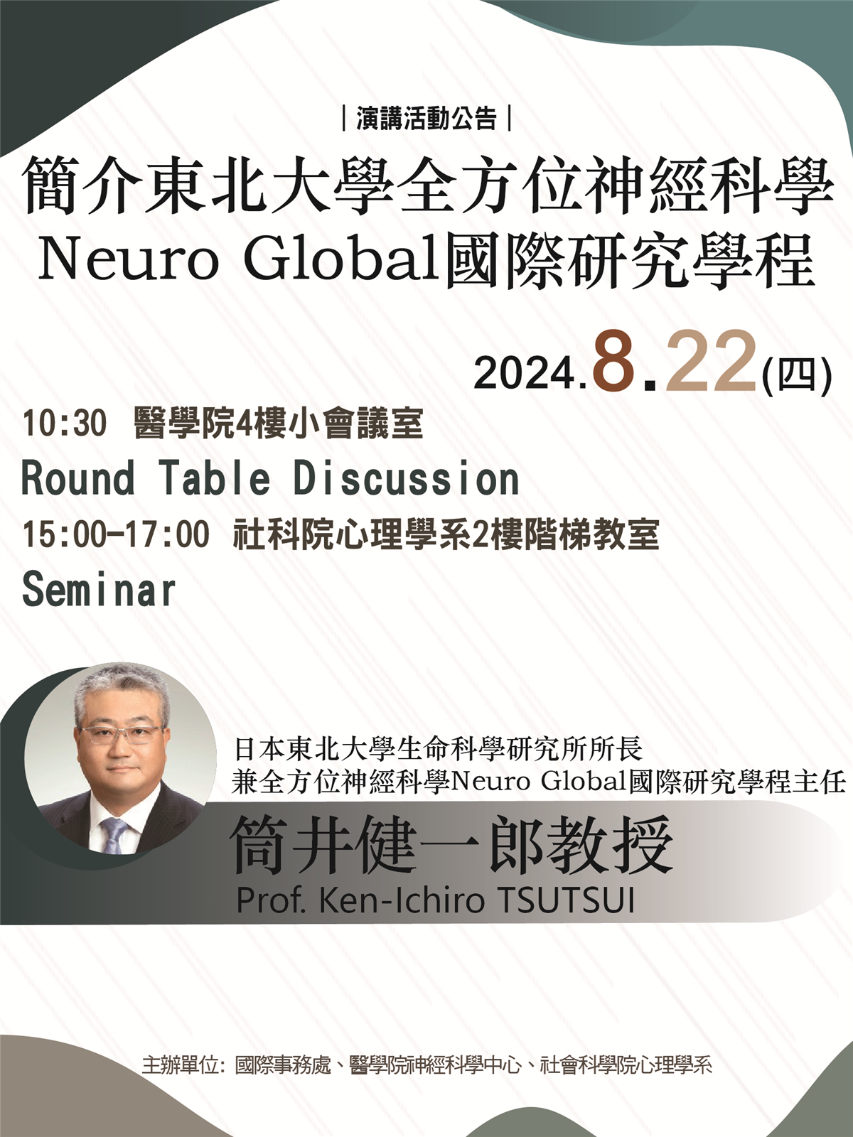 2024/9/24 日本東北大學生命科學研究所所長筒井健一郎教授來訪 日本東北大學生命科學研究所所長筒井健一郎教授來訪 與胡中凡主任及胡書榕教授進行學術交流與分享。 講題:簡介東北大學全方位神經科學Neuro Global 國際研究學程 <Back